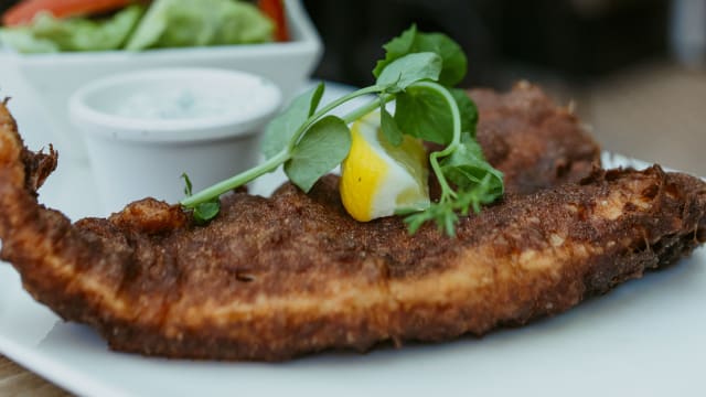 Gefrituurd in bierbeslag en geserveerd met remouladesaus, frisse groene salade, friet en mayonaise
