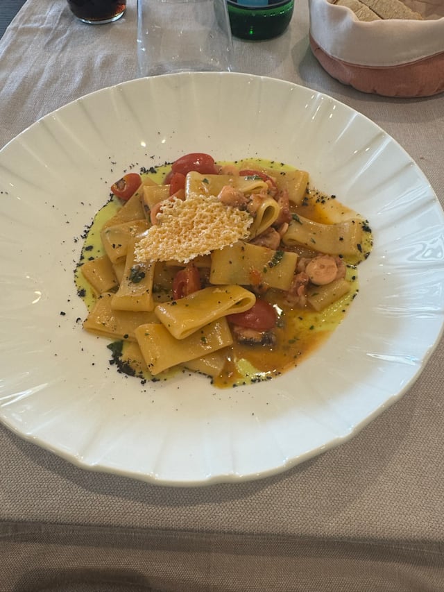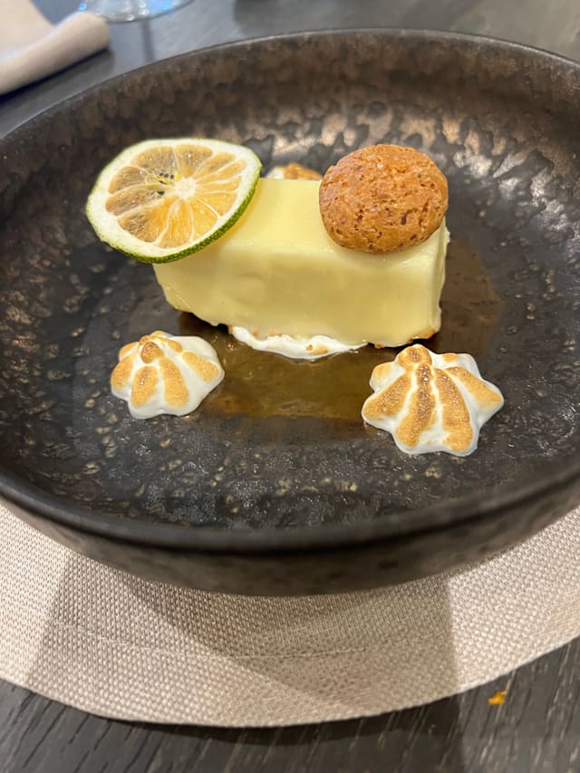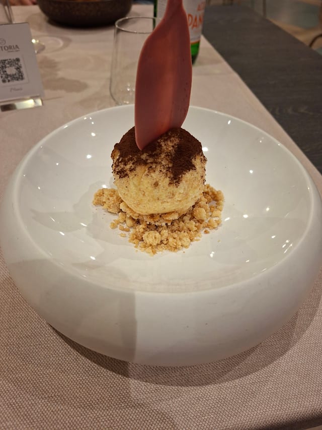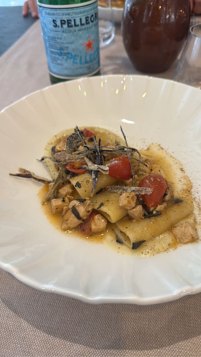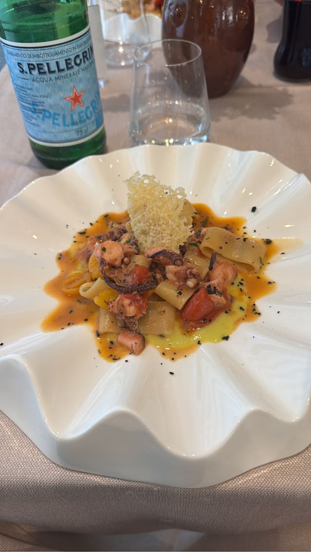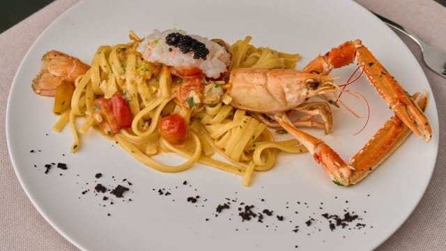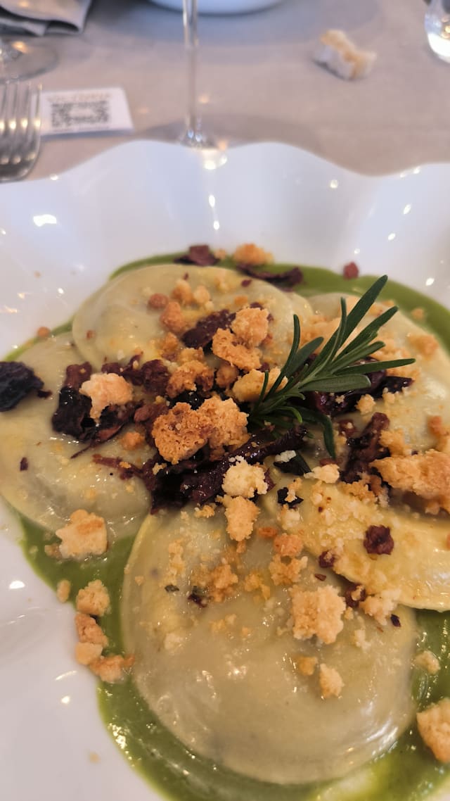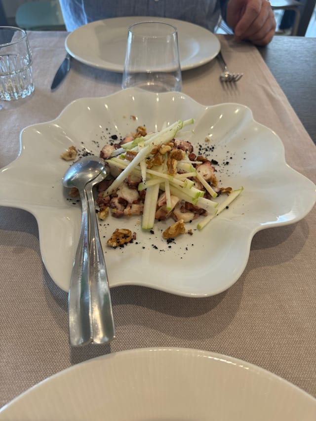 Fiore di zucca croccante in pastella leggera, farcito con gamberetti e ricotta profumata agli agrumi. Adagiato su una vellutata di zucchine fresche e accompagnato da un crumble nero dal gusto tostato, che richiama la terra. Un viaggio tra mare e orto, tra cremosità, fragranze vegetali