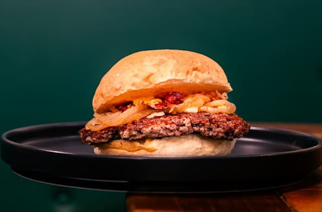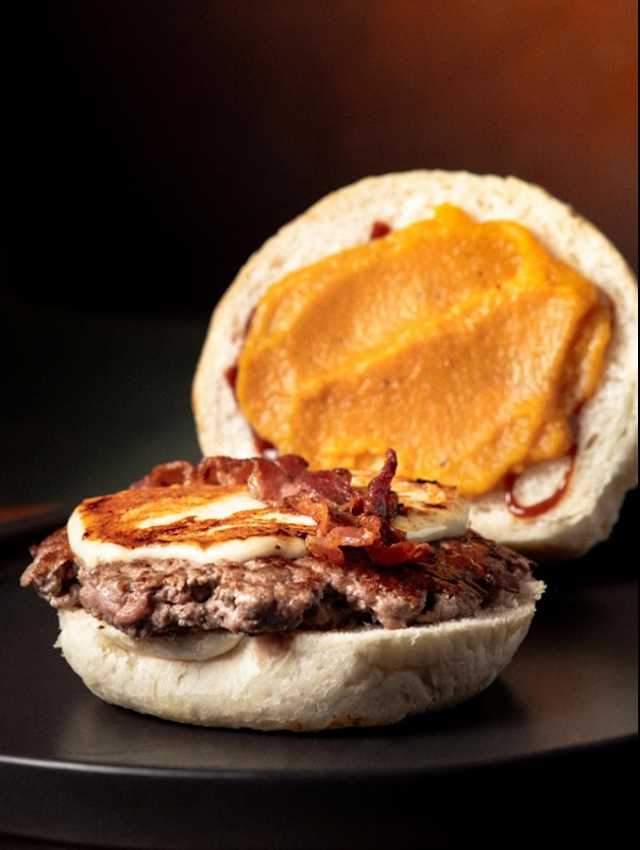 - Bun, patty 160gr, formaggio blue, cipolla carammellata, bacon croccante, senape al miele