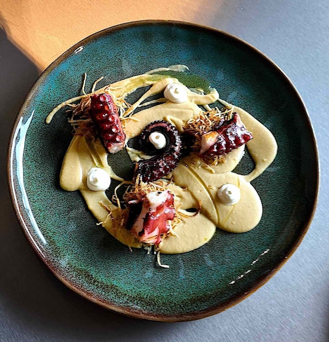 Tentacolo di Polpo piastrato, crema di ceci e jalapeños, patate croccanti, crème fraîche al Margarita