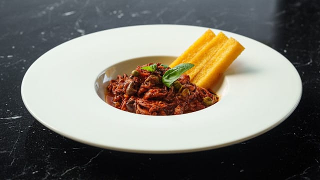Polipetti in umido, capperi lacrimella, olive taggiasche, stick di polenta