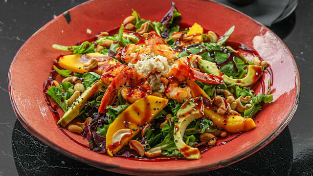 gamberi scottati, polpa di granchio, sedano, lemongrass, zenzero, avocado, mango, anacardi tostati, misticanza di campo, salsa teriyaki con sesamo bianco e nero