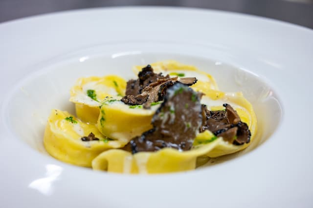 Tortelli homemade con ripieno al formaggio, riduzione di crema bianca al burro e scaglie di tartufo nero