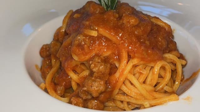 - Spaghetto "chitarra" steso a mano con sugo di carne e pallottine di carne mista