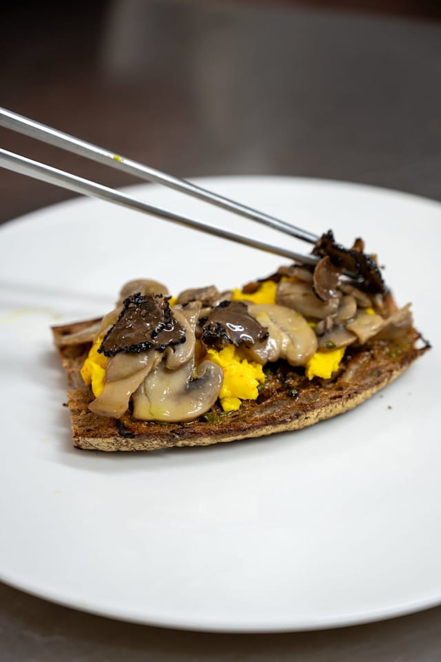 - Crostone di pane nero casereccio con funghi champinones, uovo fritto e scaglie di tartufo nero
