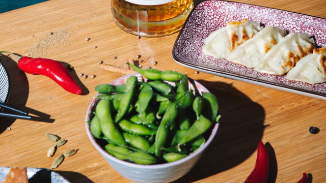 A mixed salad with edamame beans, wakame seaweed, infused shiitake mushrooms & soy vinaigrette.