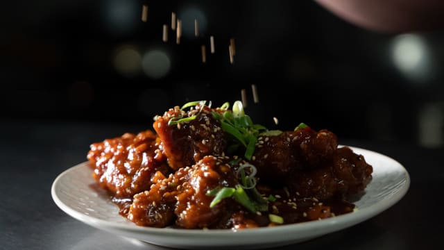 Fried chicken with moderately spiced and slightly sweet sauce with the distinctive flavor of Korean Gochugaru chili