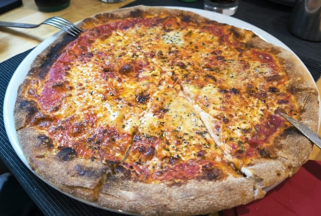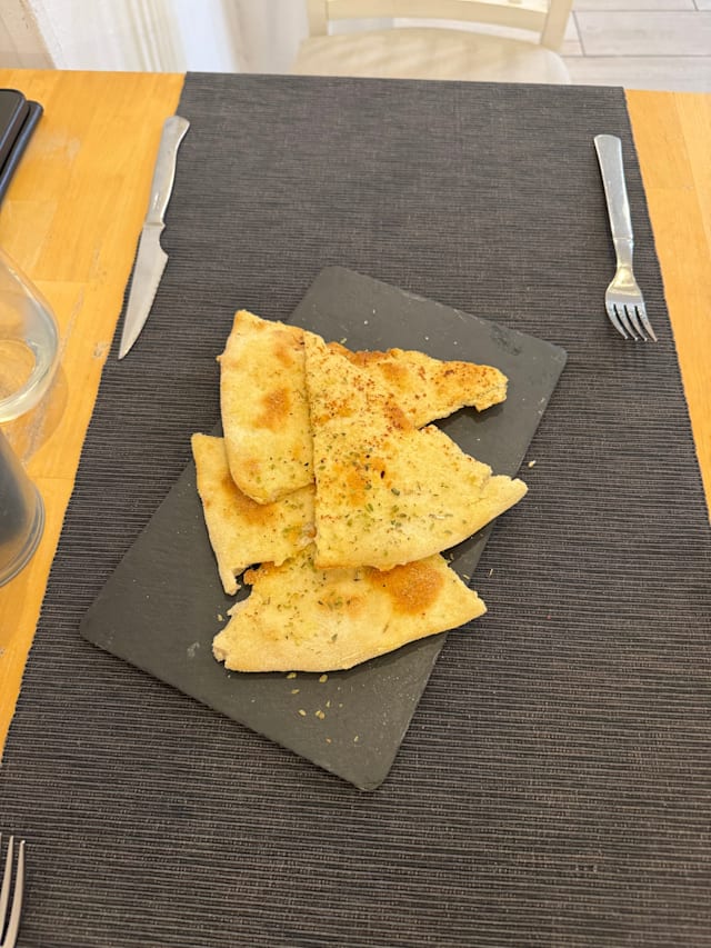 Deliciosa pizza tostada con una preparación de ajo, aceite de oliva virgen y orégano.