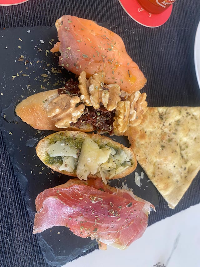 4 montaditos diferentes: tomate y serrano, queso crema y salmón ahumado, pesto verde y queso parmesano, tomate seco y nueces