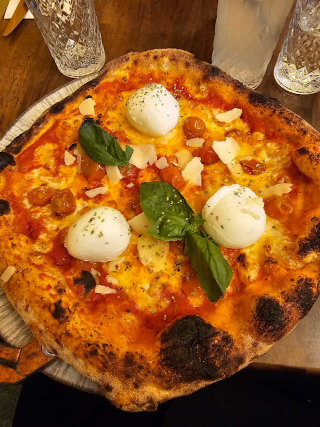 - Sauce tomate, mozzarella for di latte, parmigiano reggiano DOP, gorgonzola, provola (fromage fumé), basilic