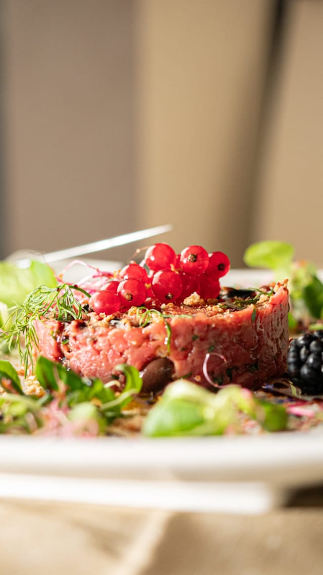 Tartare di filetto di scottona, taggiasche, cappero, cipollina e tuorlo d'uovo