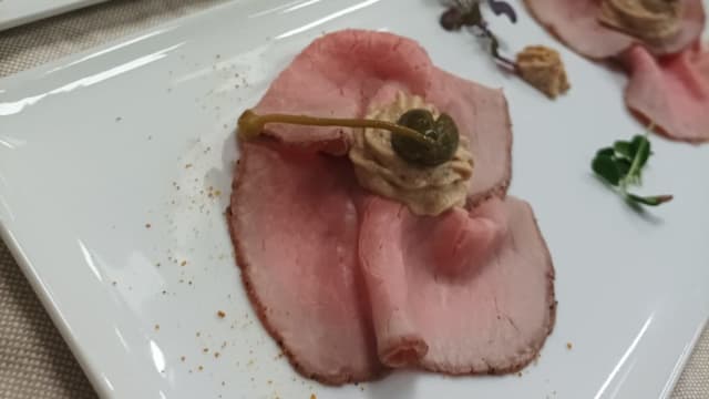 Battuta di fassona, caramello al limone, scaglie di piemontino dop e nocciole i.g.p
