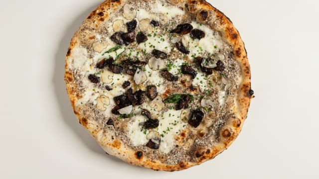 Crema de trufa negra, queso ricotta, mozzarella fior di latte, champiúones salteados, trufa bresca de temporada y cebollino