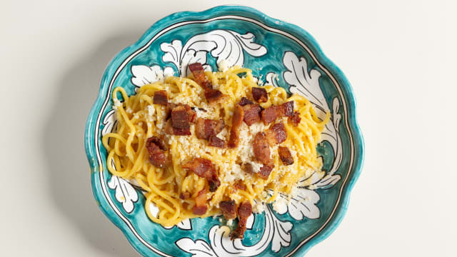 Spaghetti con salsa de tomate, guanciale (carne de cerdo), parmigiano reggiano y queso pecorino