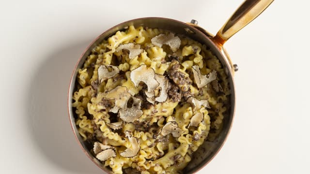 Mafaldine caseras con crema de trufa, champinones y copos de trufa negra fresca. Imbatible. suplemento de stracciatella
