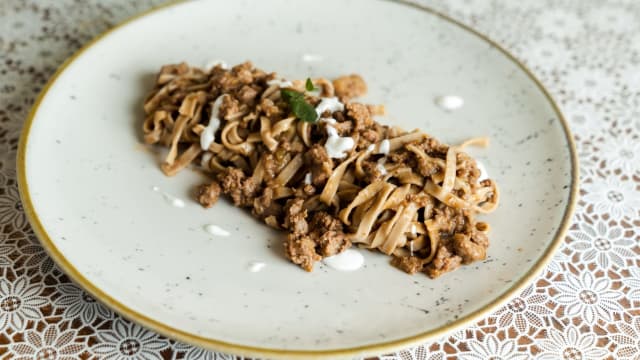 Tagliatelle all’uovo con fondo bruno e funghi porcini