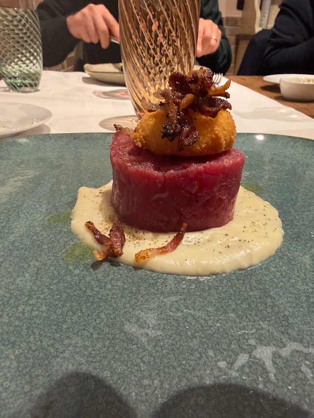 Tartare di manzo piemontese su fonduta di pecorino, uovo in doppia consistenza e guanciale croccante