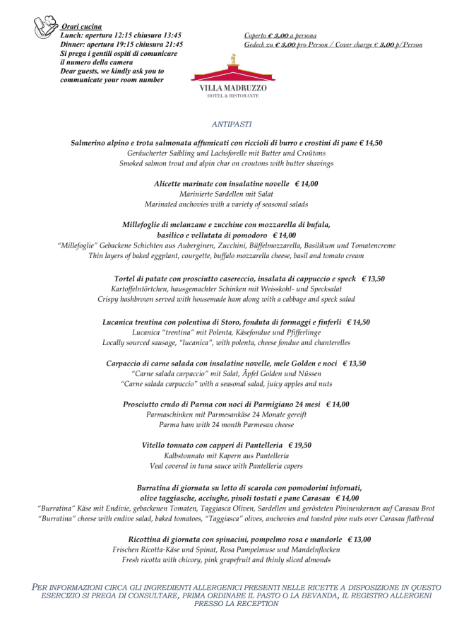 10/10We had dinner in the restaurant and it was fantastic. I had grilled fish and my husband tagliata. The first course pasta was home made and great. The wine was excellent, the service also and we enjoyed every minute in this nice restuarant.