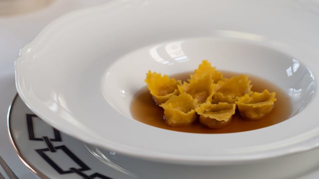 Cappelletti con parmigiano reggiano 30 mesi, pecorino stagionato, fave e menta