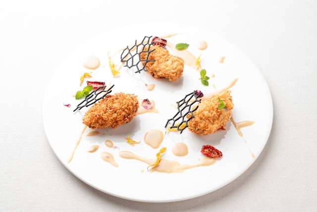 - Croquette di gambero argentino impanata con mais soffi ato e pop corn e decorata con fonduta di pecorino romano dop, cremoso al tuorlo d’uovo e guanciale amatriciano igp croccante.