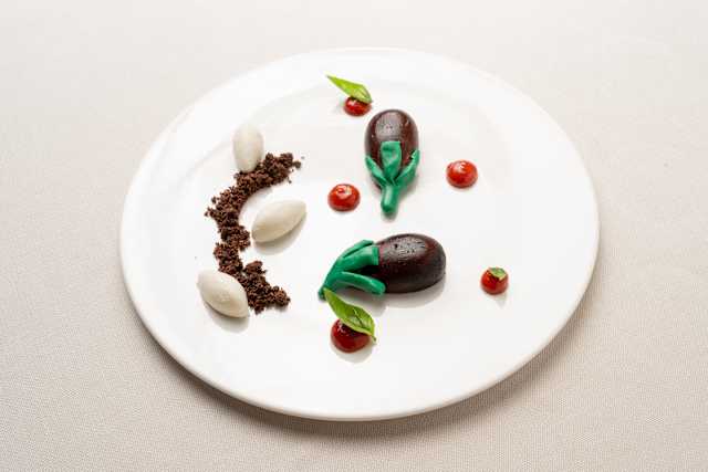 - Un abbraccio tra il cuore dorato del tuorlo, una muosse vellutata al pistacchio e la dolcezza esotica del mango, racchiusi poi in un guscio croccante ai cioccolati, adagiati su pasta kataifi intrecciata come fili di seta.