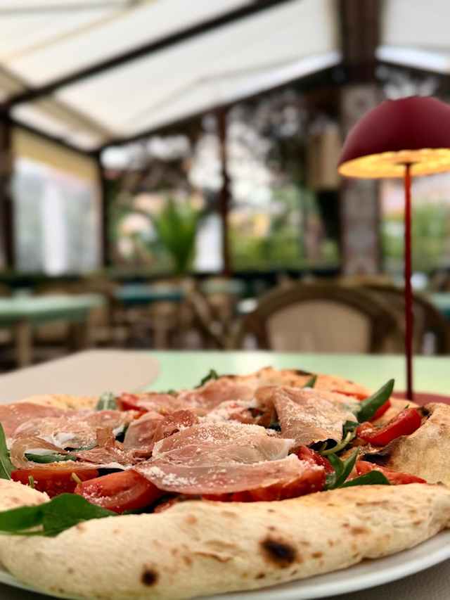 - Mozzarella, prosciutto crudo, pomodorini, rucola, scaglie di parmigiano