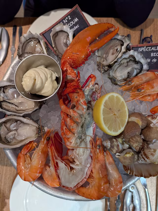 - ½ Beau homard d’amérique du nord | 6 belles crevettes roses bio | 2 spéciales n°3 gillardeau | 2 fines n°3 "prat ar coum", finistère nord | 2 spéciales n°4 bio de quiberon | bulots