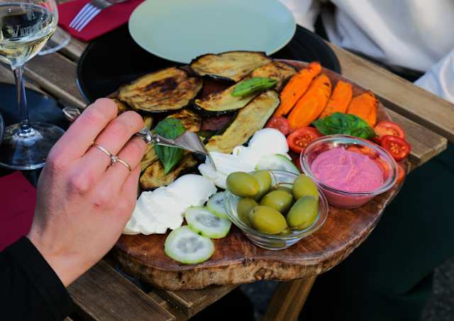 - (Verdure al forno, verdure fresche, mozzarelline, hummus)