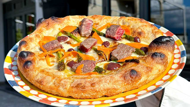 Impasto fritto e poi al forno, culatta di prosciutto crudo, pesto di rucola, stracciata, pomodoro datterino semidry