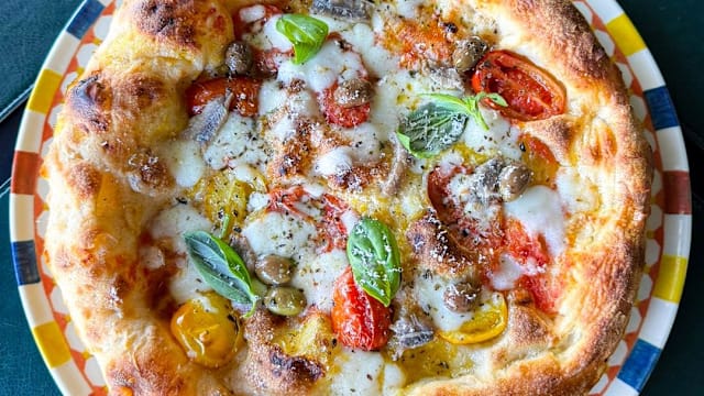 Pomodoro giallo, pomodoro rosso, fior di latte, origano del monte, olive taggiasche, polvere di cappero, acciughe di cetara, pecorino, olio extra vergine monocultivar colli guardiesi