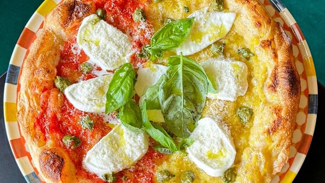 Pomodoro del piennolo del vesuvio, origano del monte, crema all'aglio, mozzarella di bufala campana, olive tagiasche, piennolo confit, olio extra vergine monocultivar colli guardiesi