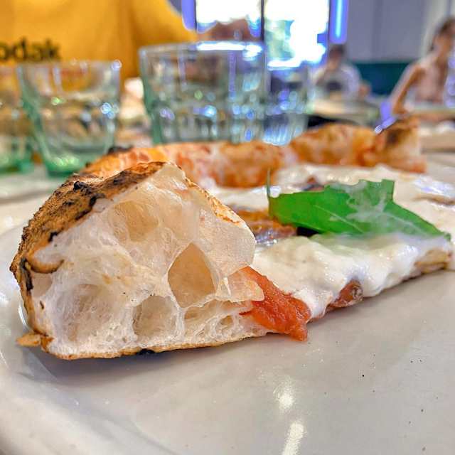 - Cornicione ripieno di ricotta dei monti, pomodorino giallo, mozzarella di bufala dop, in uscita dal forno: scaglie di pecorino romano, tarallo napoletano con sugna, pepe e mandorle sbriciolato, olio evo e basilico