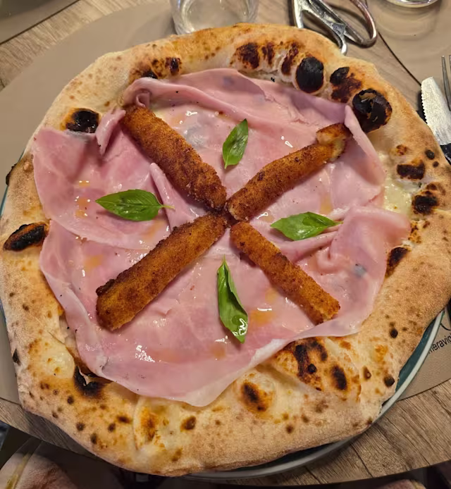 - Base con fiordilatte dei monti e pepe macinato. In uscita: crocchè napoletano, prosc, cotto, olio evo e basilico