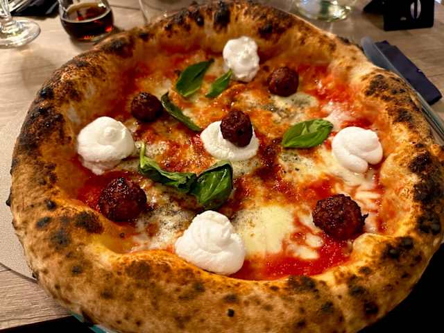 - Cornicione ripieno di ricotta, base con fior di latte dei monti, polpettine classiche di nonno enzo, fonduta di grana padano, mozzarella di bufala dop, olio evo e basilico