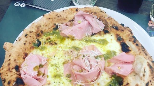 Base con fiordilatte dei monti. In uscita: mortadella di bologna, granella e crema di pistacchio, scaglie di pecorino romano, olio evo e basilico