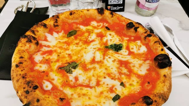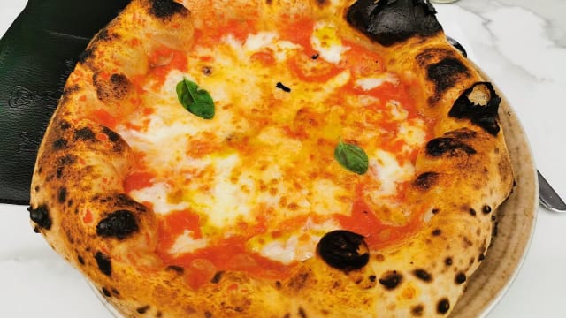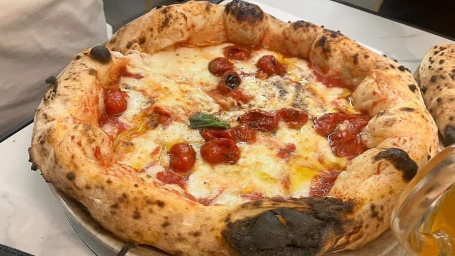 Passata di pomodorini del piennolo, fiordilatte dei monti, olive taggiasche, funghi porcini. In uscita: cuore di carciofo, prosciutto cotto, olio evo e basilico
