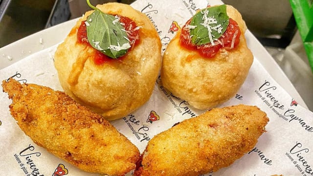 Cornicione ripieno di ricotta, pomodorino giallo, mozzarella di bufala. In uscita: scaglie di pecorino romano, croccante pane profumato, olio evo e basilico