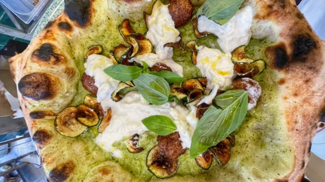 Base con mozzarella di bufala, patate al forno e salsiccia napoletana. In uscita: bocconcini di mozzarella di bufala, olio evo e basilico
