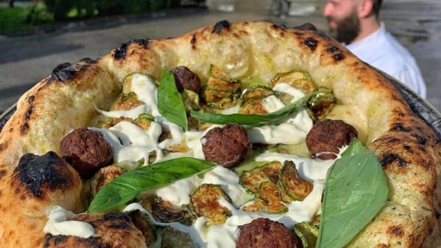 Cornicione ripieno di ricotta, base con fiordilatte dei monti, polpettine classiche di nonno enzo, fonduta di formaggio fatta in casa, mozzarella di bufala, olio evo e basilico