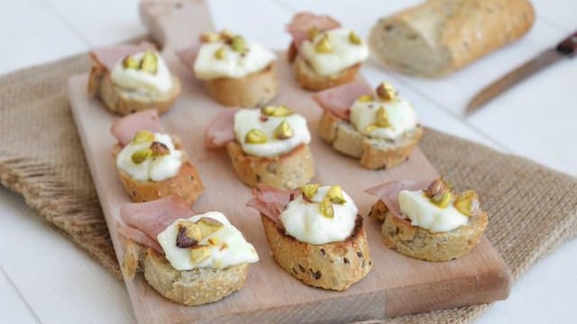Crostoni con mortadella IGP villani, stracciatella, granella di pistacchio & pesto di basilico