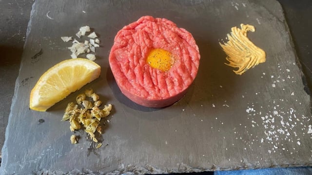 Tartare di fassona italica, battuto di cipolla, olio, sale, pepe, capperi e salsa worchester