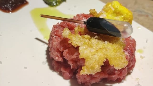battuta di manzo al coltello accompagnata de Sale di Maldon, olio extravergine di olive da spremitura a freddo e salse in accompagnamento