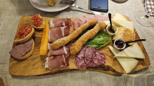 Presentato su un bellissimo tagliere di ulivo, lo chef Vi propone un antipasto assortito con salumi, formaggi, frittini, strudel di sfoglia, bruschette, mostarde e miele accompagnato da i nostri grissini fritti