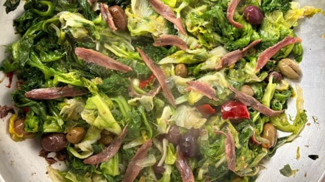 Bruschetta con base di crema di fagioli, borlotti e cannellini, accompagnata da scarola ripassata con olive taggiasche