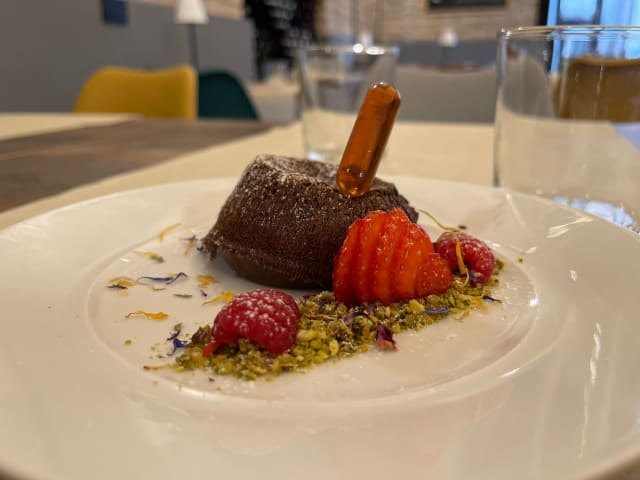 Tortino al cioccolato fondente con cuore morbido e fiala di amaro silano
