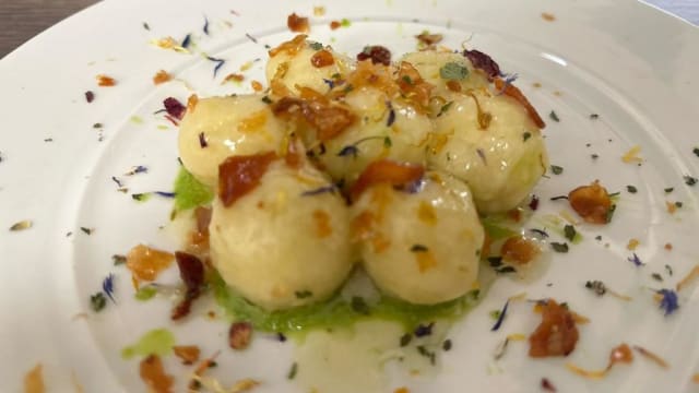 Gnocchi homemade ripieni di caciocavallo silano dop su fonduta di piselli con prosciuttella croccante