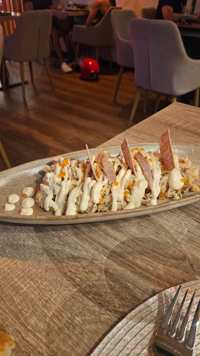 Ensaladilla rusa con ventresca de bonito del norte y huevas de trucha, servida con regañas de bellota.