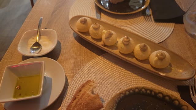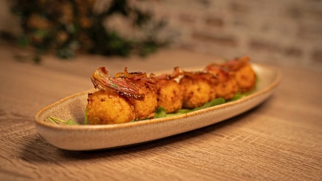 Croquetas de jamón 100% ibérico de bellota servidas con un velo de panceta ibérica fundente.