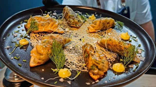 Crujientes esferas rellenas de brandada de bacalao casera, terminadas con ligera emulsión de ajo negro.