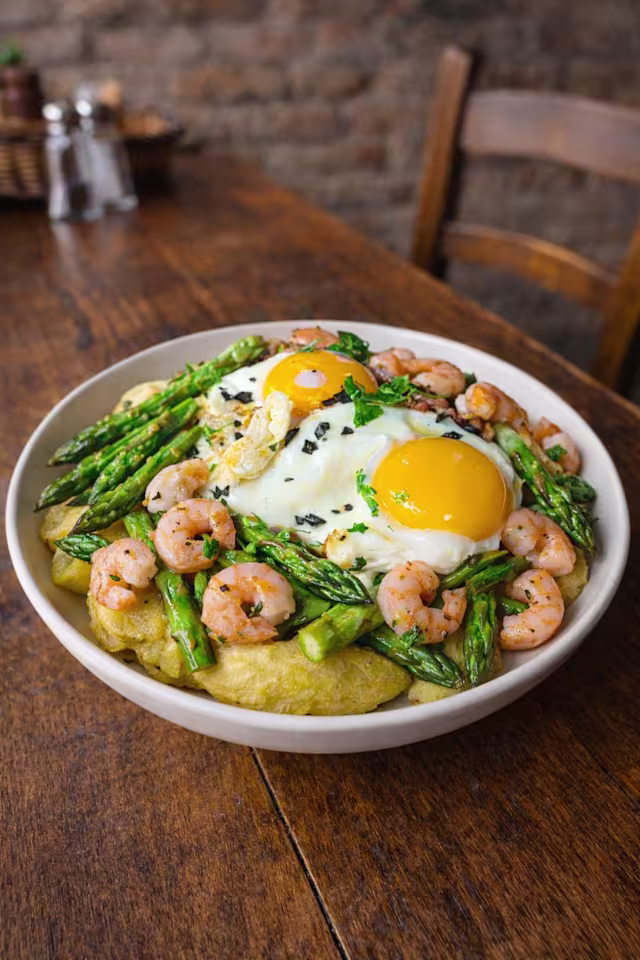 - HUEVOS ESTRELLADOS CON ESPARRAGOS Y GAMBAS